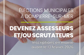 Les élections municipales auront lieu les dimanches 15 et 22 mars 2026 à Dompierre-sur-Mer. La municipalité lance un appel aux citoyens pour participer activement au bon déroulement du scrutin en devenant assesseurs ou scrutateurs bénévoles.