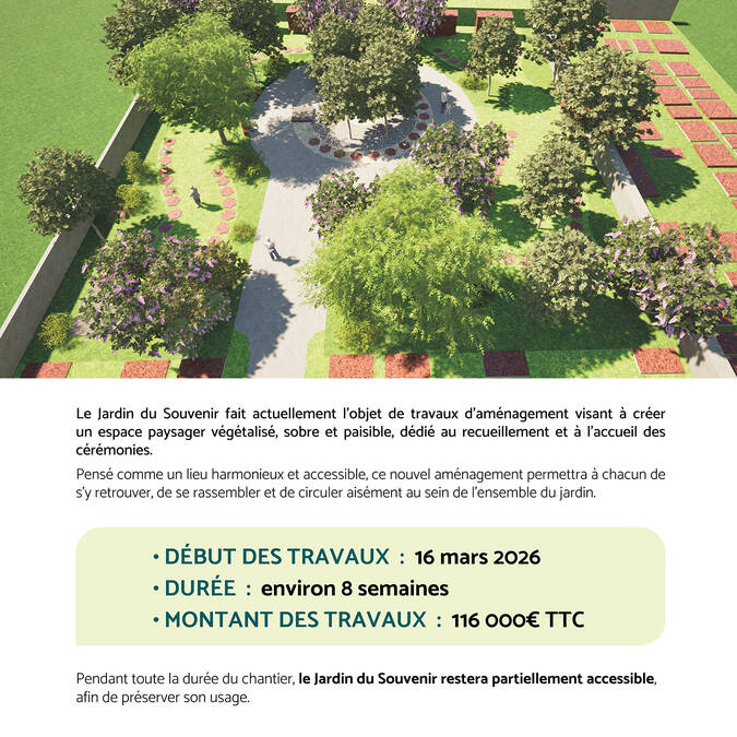 Lancement des travaux d'aménagement du Jardin du Souvenir le 16 mars 2026 pour une durée estimée à 8 semaines.