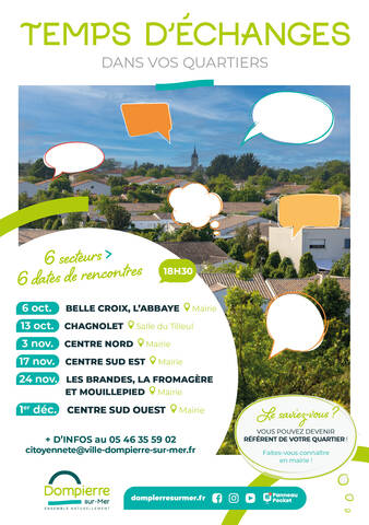 L'équipe municipale de Dompierre-sur-Mer vous convie à six rencontres citoyennes, qui se dérouleront du 6 octobre au 1er décembre 2025.