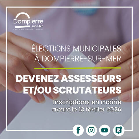 Les élections municipales auront lieu les dimanches 15 et 22 mars 2026 à Dompierre-sur-Mer. La municipalité lance un appel aux citoyens pour participer activement au bon déroulement du scrutin en devenant assesseurs ou scrutateurs bénévoles.
