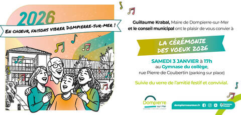 Guillaume Krabal, Maire de Dompierre-sur-Mer, et le conseil municipal invitent les Dompierroises et Dompierrois à la cérémonie des vœux qui se tiendra samedi 3 janvier 2026 à 17h, au gymnase du SIVU.