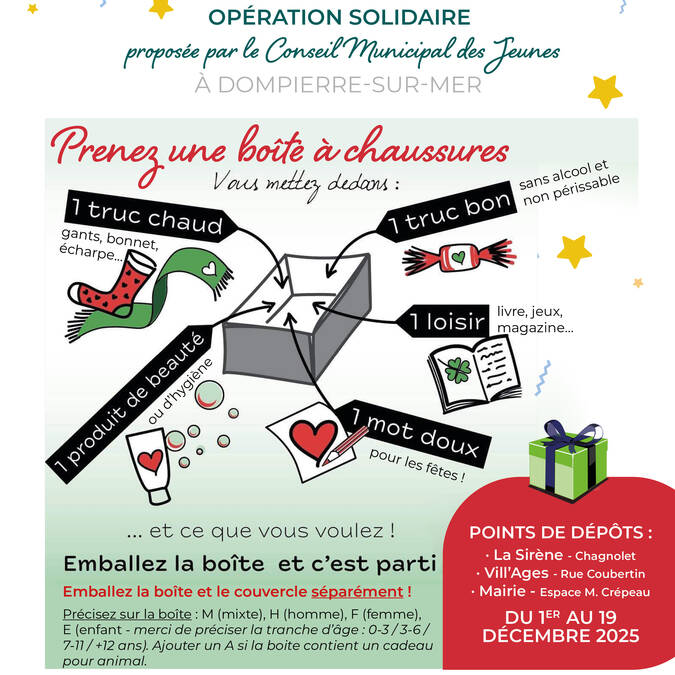 La Ville de Dompierre-sur-Mer et le Conseil municipal des jeunes renouvellent leur participation au dispositif "Boîte de Noël" dont l'objectif est d'adoucir le quotidien des plus démunis pendant les fêtes de fin d'année.