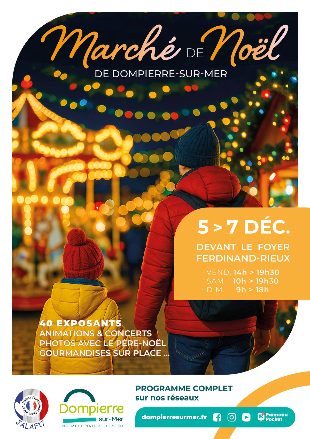 Du 5 au 7 décembre 2025, le centre-bourg de Dompierre-sur-Mer accueillera son traditionnel Marché de Noël. Trois jours placés sous le signe de la convivialité, du savoir-faire local et de la magie des fêtes, à partager en famille ou entre amis.