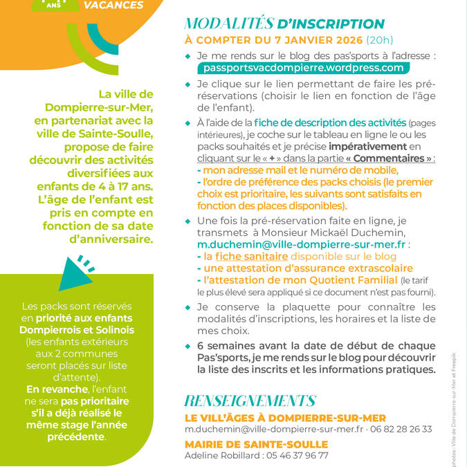 Les inscriptions se font en ligne sur le site passportsvacdompierre.wordpress.com. Attention, les places sont limitées et la priorité est accordée aux habitants de Dompierre-sur-Mer et Sainte-Soulle. Les tarifs sont calculés selon le quotient familial.
