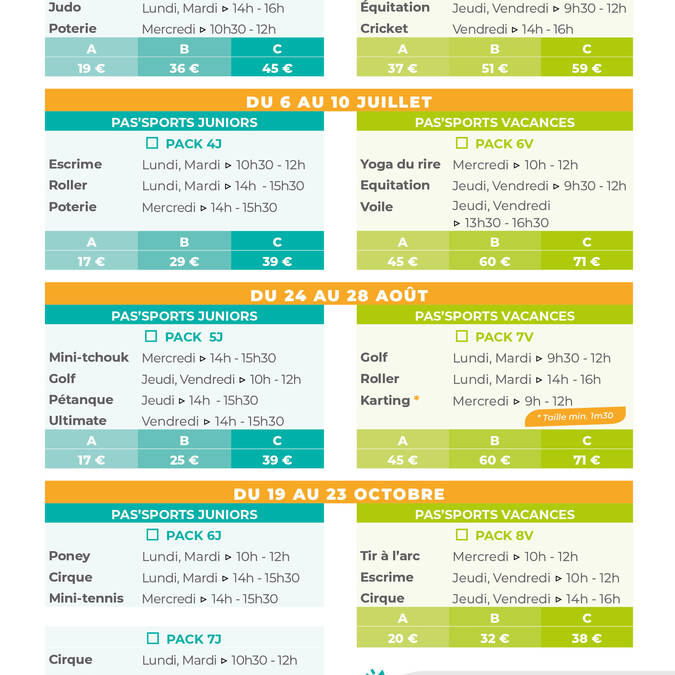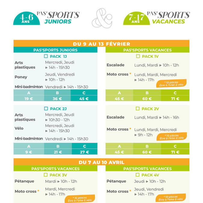 Le principe du Pas'Sports est simple et innovant : plutôt que de choisir une seule activité, les participants découvrent plusieurs disciplines au sein de packs de 5 demi-journées comprenant 2 à 3 activités par stage. Une formule idéale pour permettre aux jeunes de tester différentes pratiques et de révéler des talents insoupçonnés.