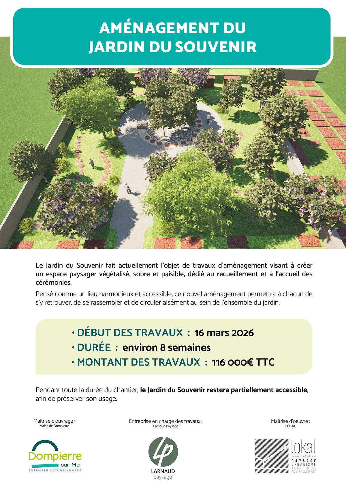Cet aménagement s'inscrit dans la volonté de la Ville d'améliorer durablement les lieux de mémoire et de patrimoine de la commune. Le nouveau Jardin du Souvenir offrira aux Dompierrois(es) un cadre de vie amélioré, propice au respect et à la dignité des cérémonies.